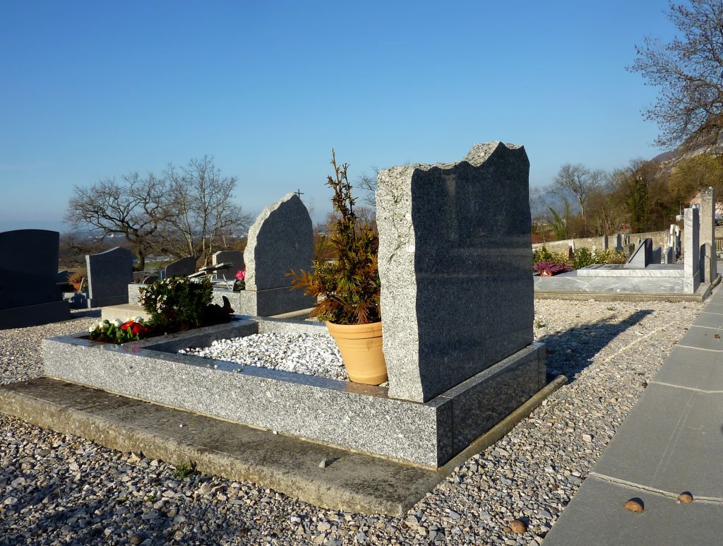 - Le caveau est fermé en surface par une plaque de pierre (semelle) recouverte selon les souhaits d’une pierre tombale, d’une stèle et d’un prie-Dieu ou soubassement.